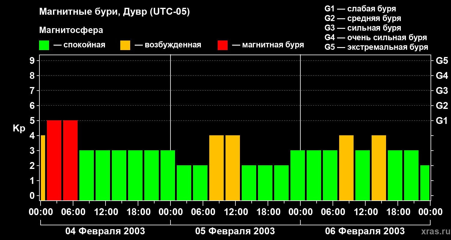 Изменения геомагнитного индекса Kp с 4 по 6 февраля 2003 года для средних широт