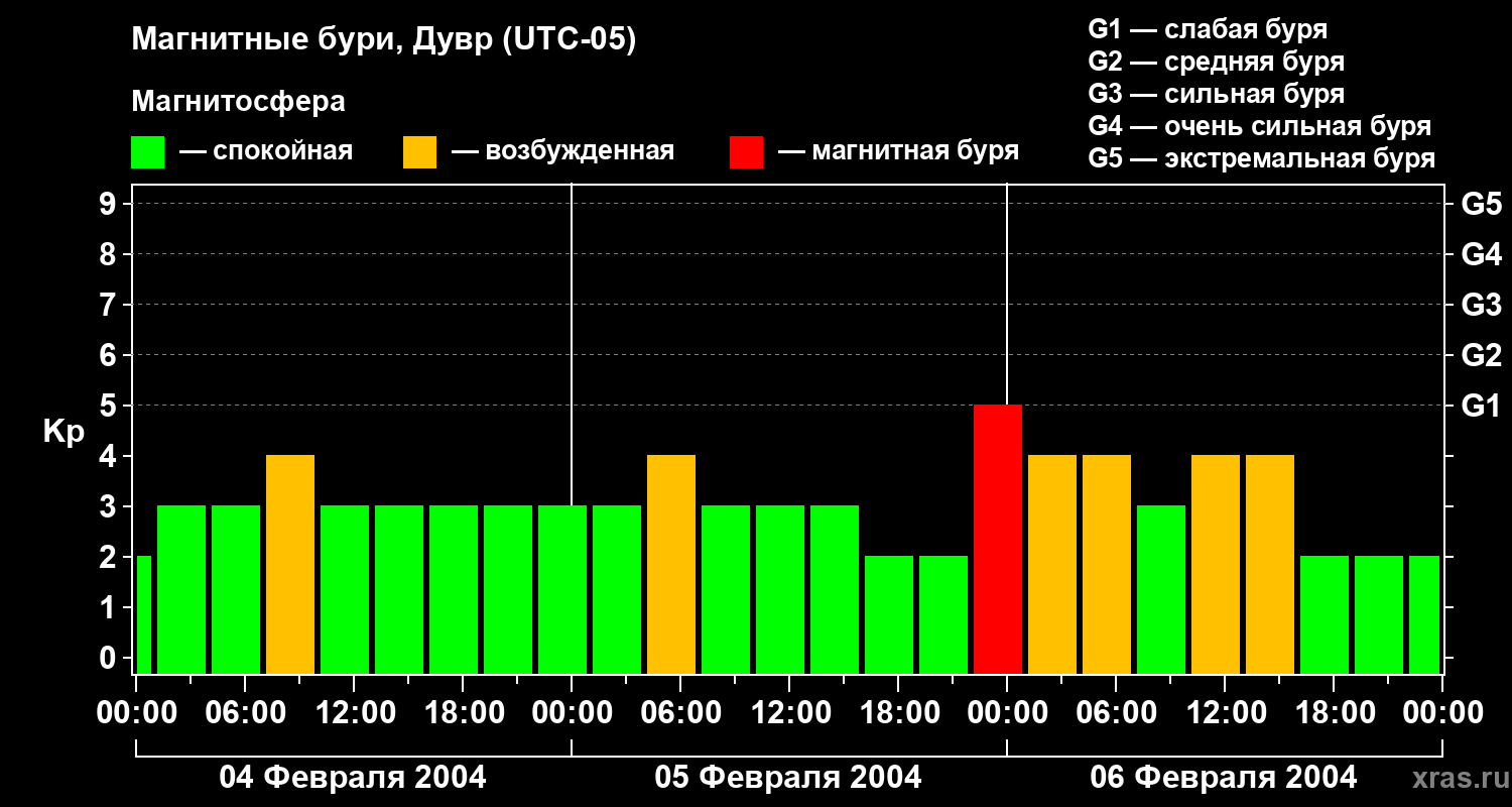Изменения геомагнитного индекса Kp с 4 по 6 февраля 2004 года для средних широт