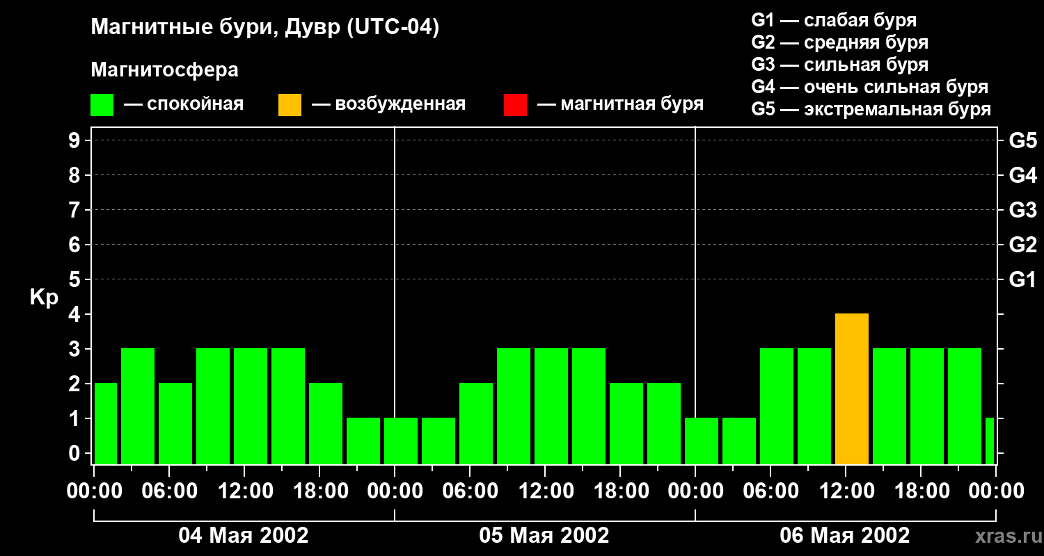 Изменения геомагнитного индекса Kp с 4 по 6 мая 2002 года для средних широт