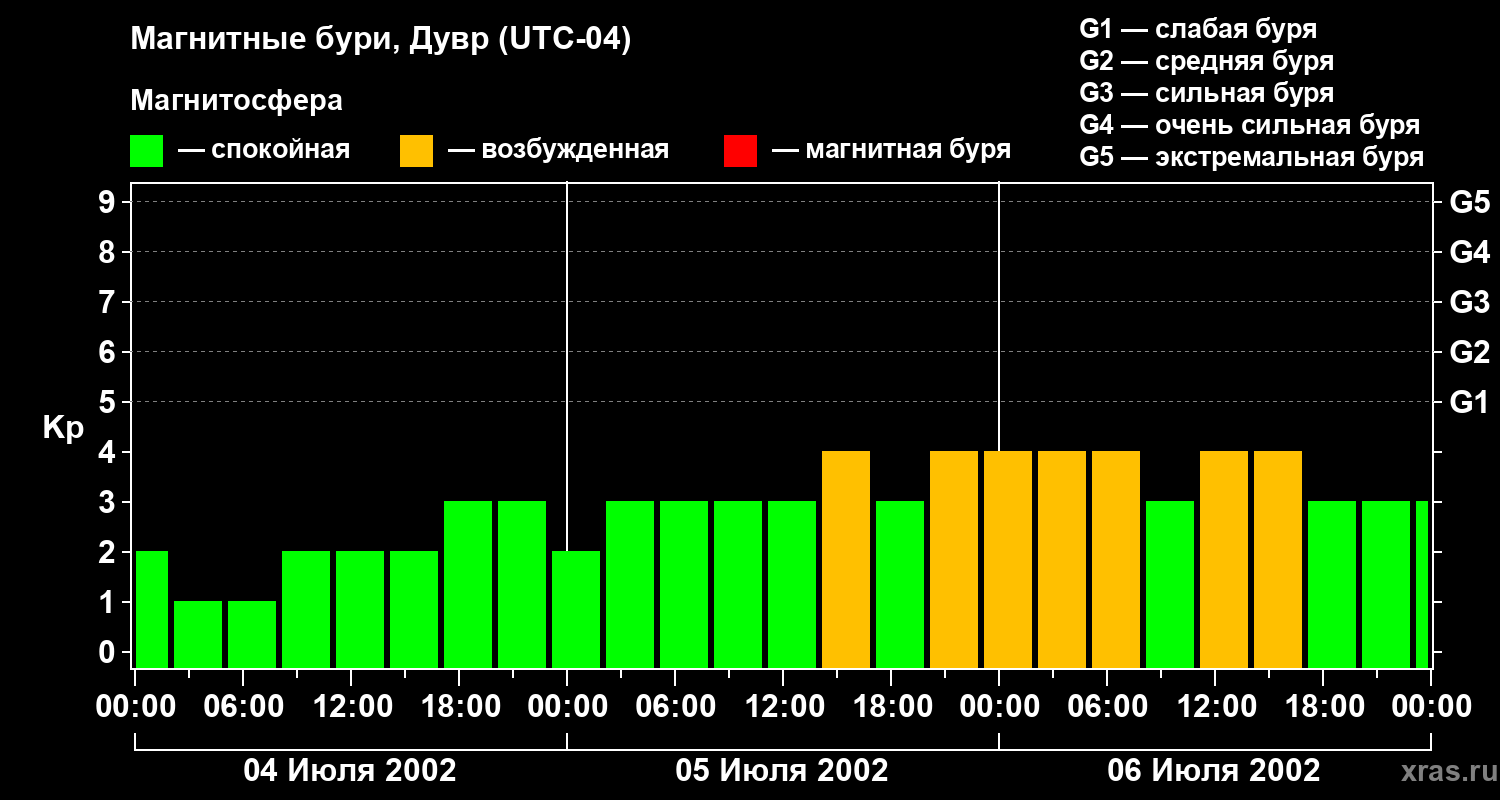 Изменения геомагнитного индекса Kp с 4 по 6 июля 2002 года для средних широт