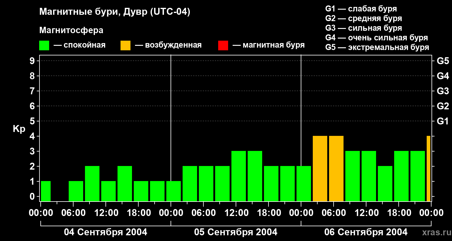 Изменения геомагнитного индекса Kp с 4 по 6 сентября 2004 года для средних широт
