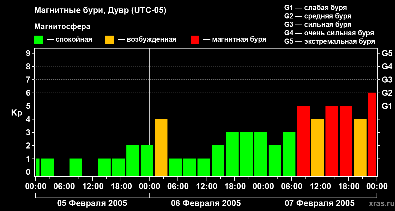 Изменения геомагнитного индекса Kp с 5 по 7 февраля 2005 года для средних широт