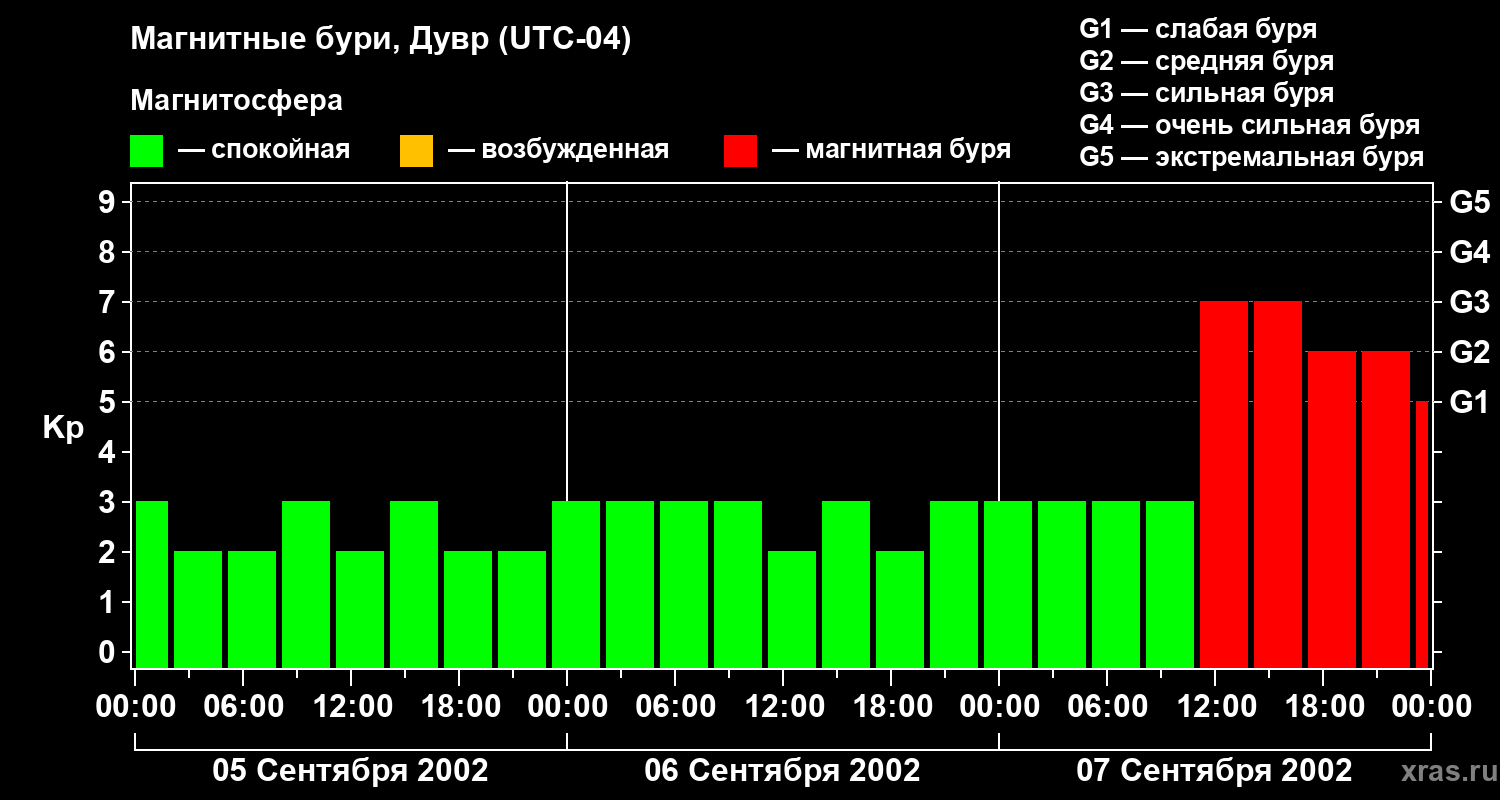 Изменения геомагнитного индекса Kp с 5 по 7 сентября 2002 года для средних широт
