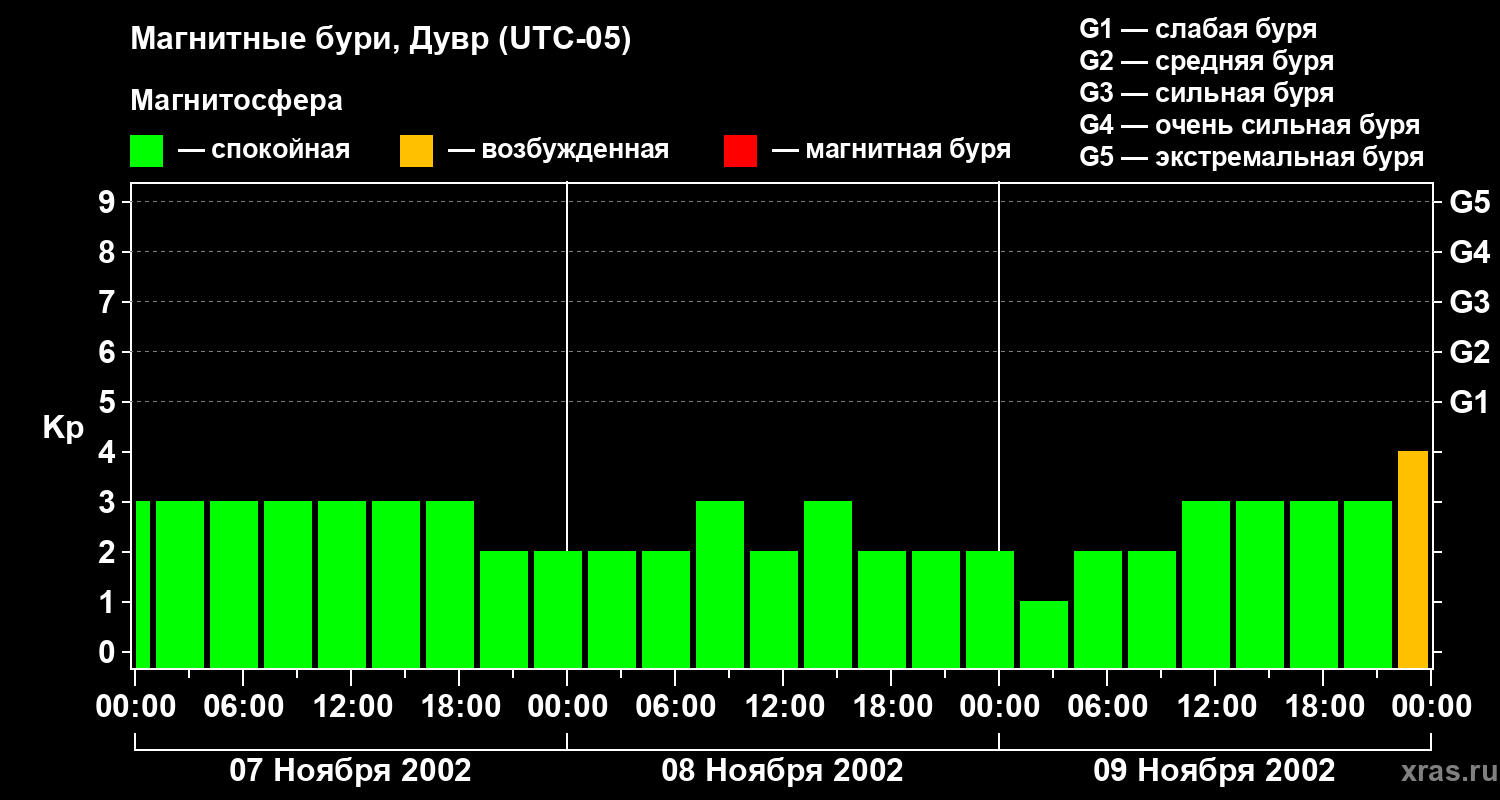Изменения геомагнитного индекса Kp с 7 по 9 ноября 2002 года для средних широт