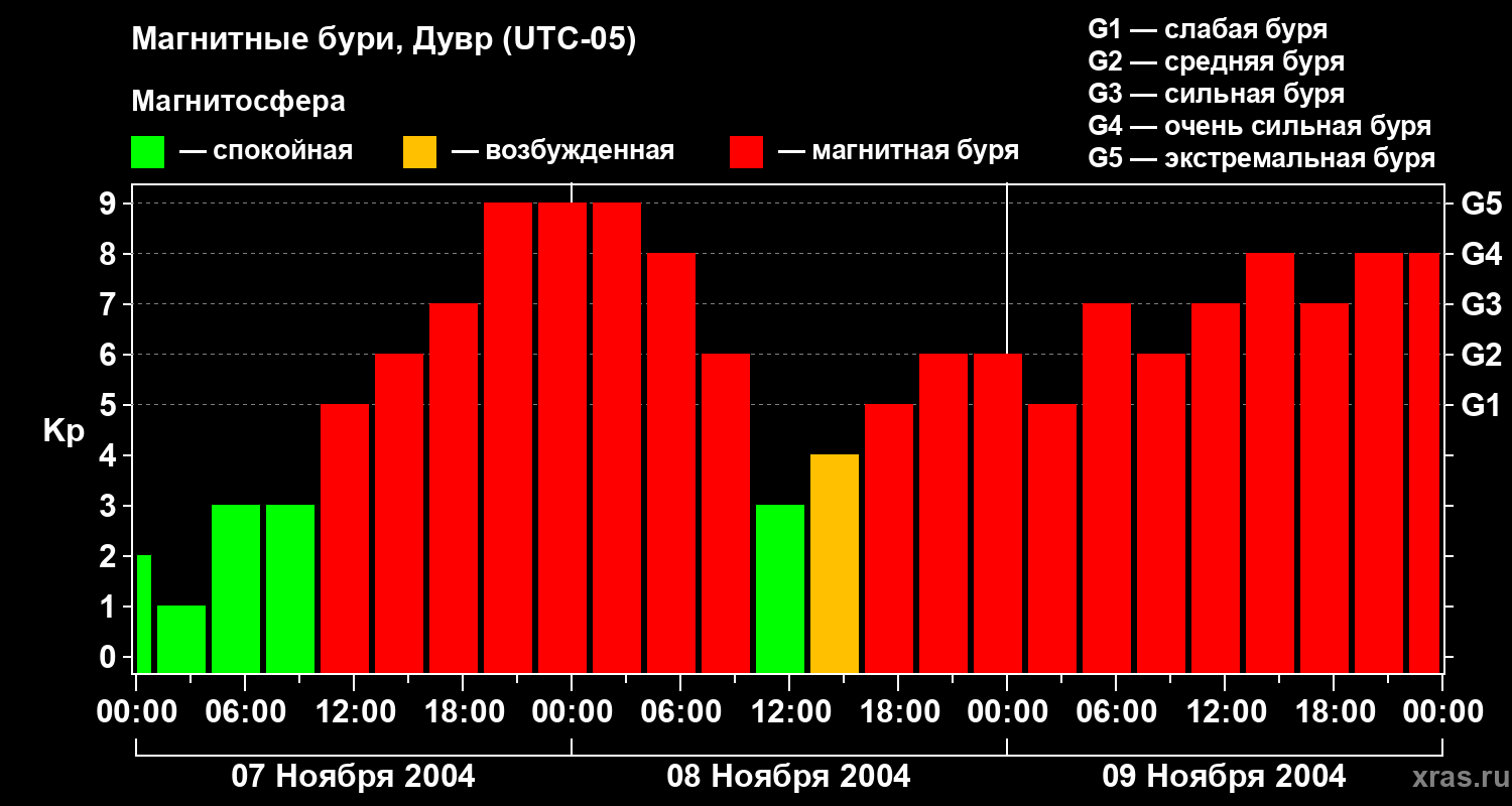 Изменения геомагнитного индекса Kp с 7 по 9 ноября 2004 года для средних широт