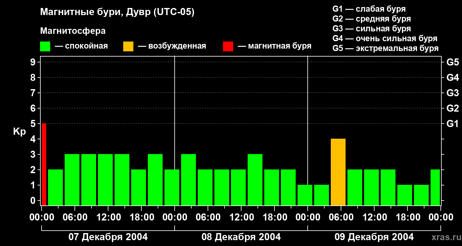 Изменения геомагнитного индекса Kp с 7 по 9 декабря 2004 года для средних широт