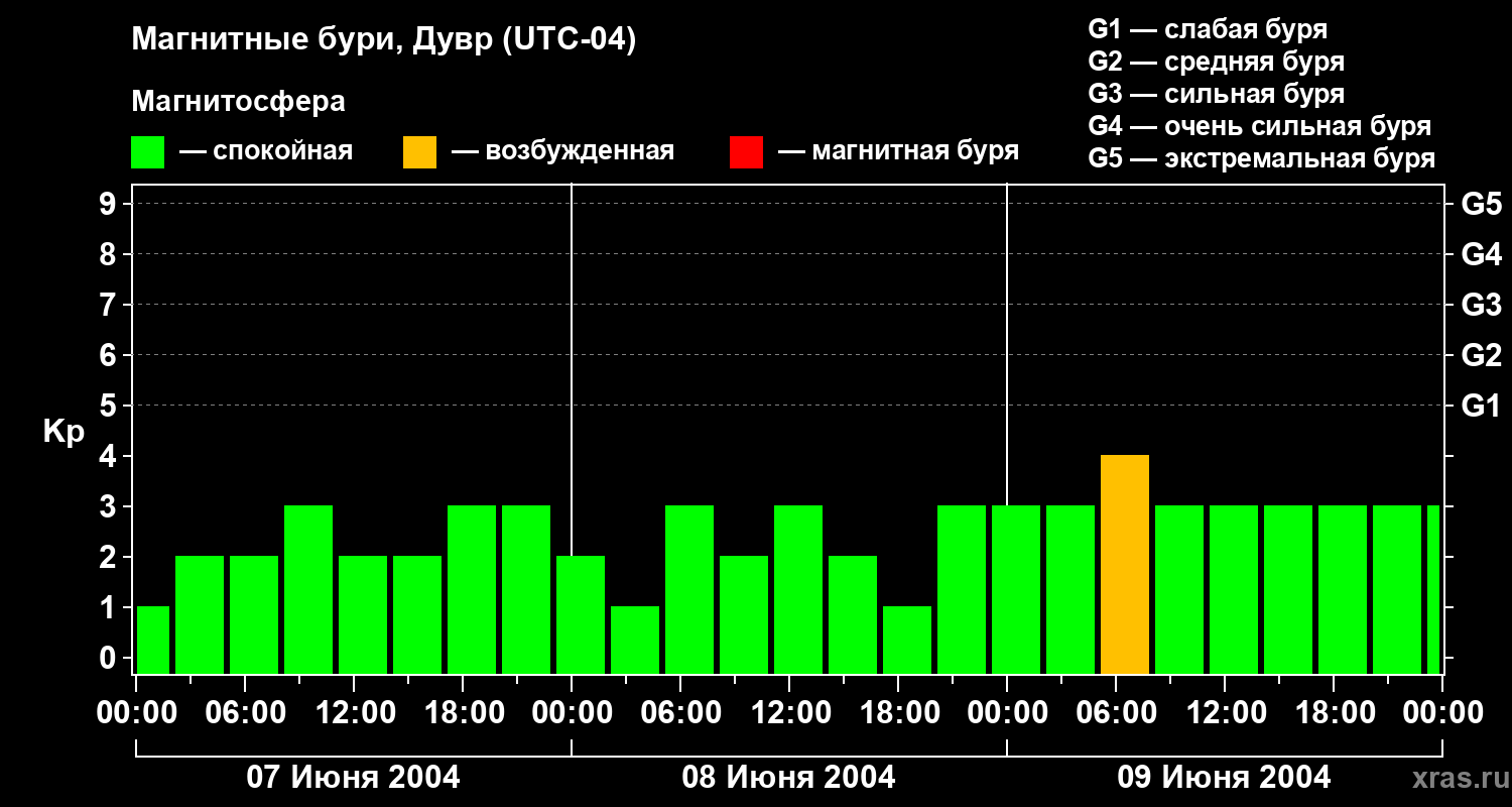 Изменения геомагнитного индекса Kp с 7 по 9 июня 2004 года для средних широт