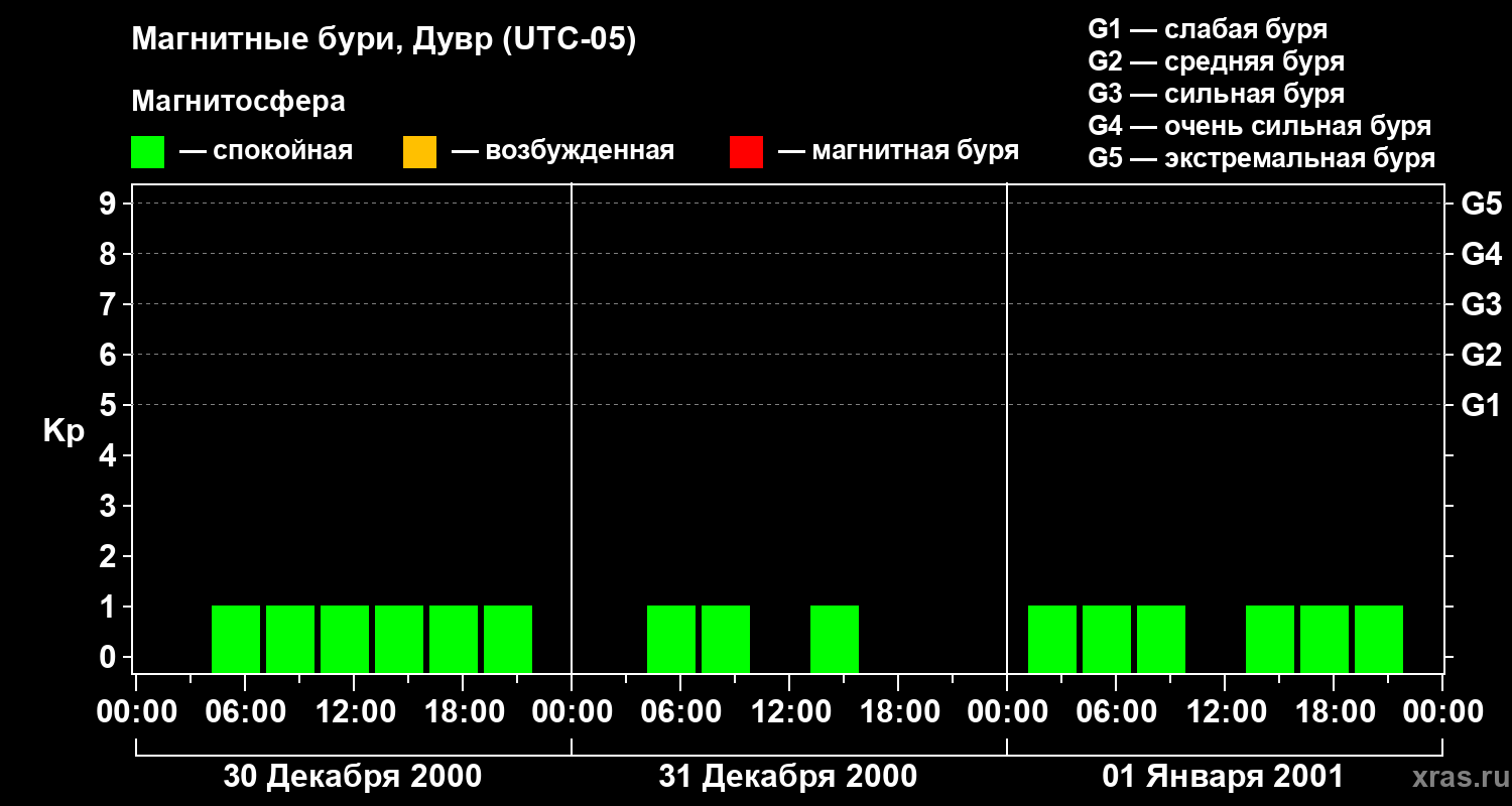Изменения геомагнитного индекса Kp с 30 декабря 2000 года по 1 января 2001 года для средних широт