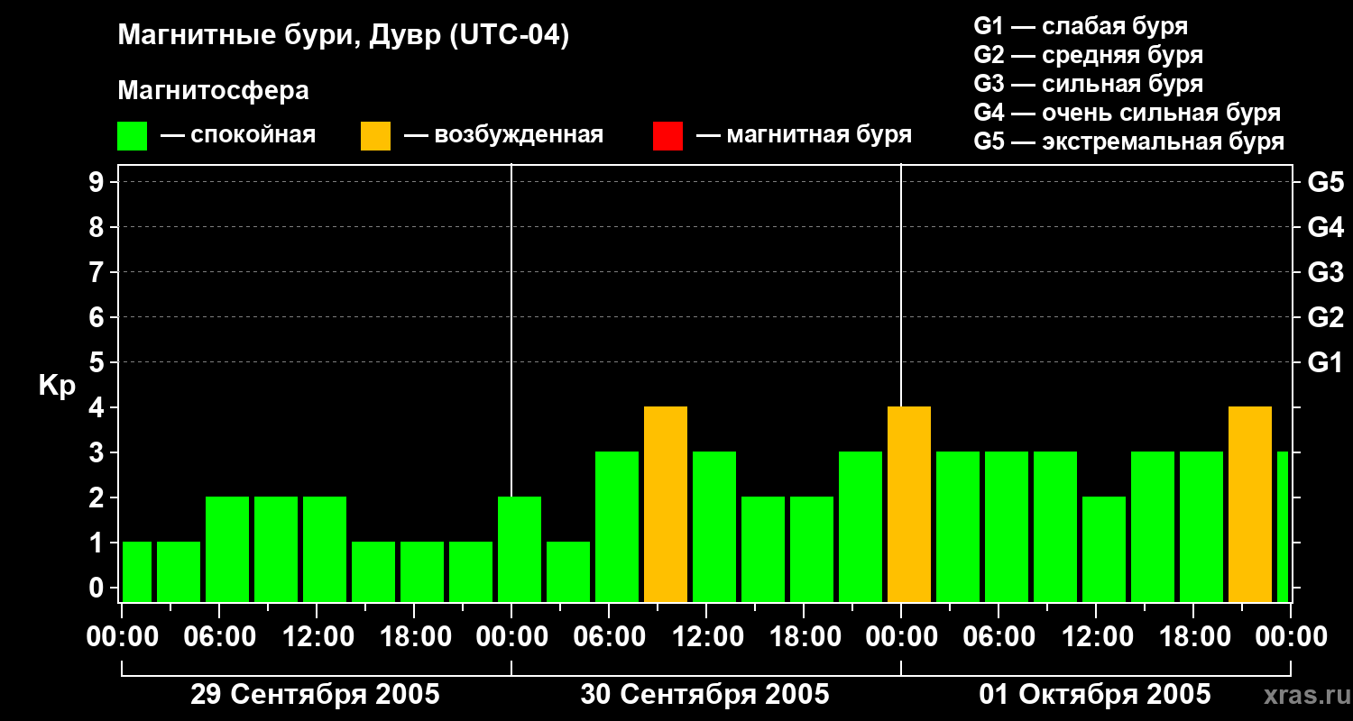 Изменения геомагнитного индекса Kp с 29 сентября по 1 октября 2005 года для средних широт