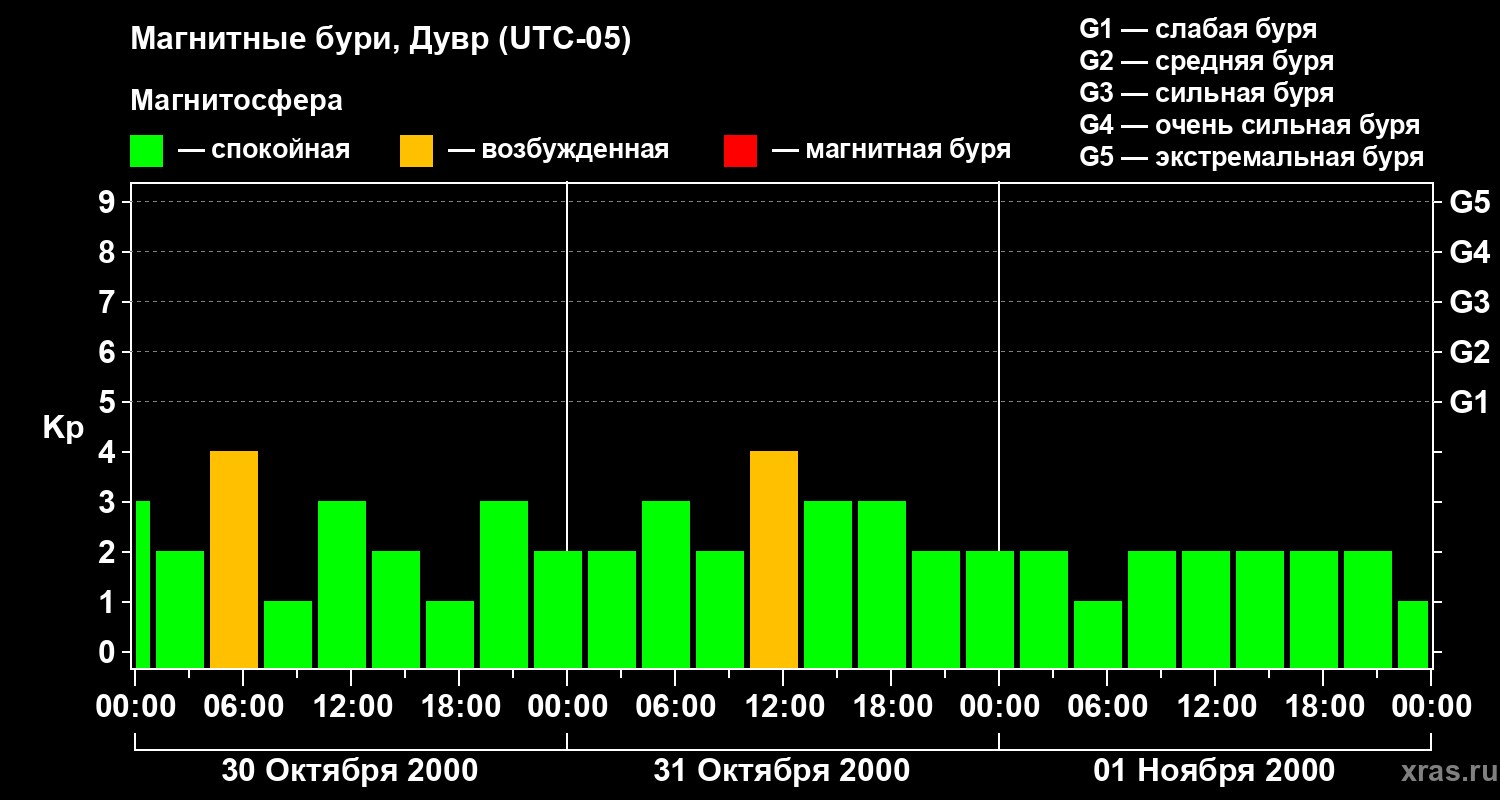Изменения геомагнитного индекса Kp с 30 октября по 1 ноября 2000 года для средних широт
