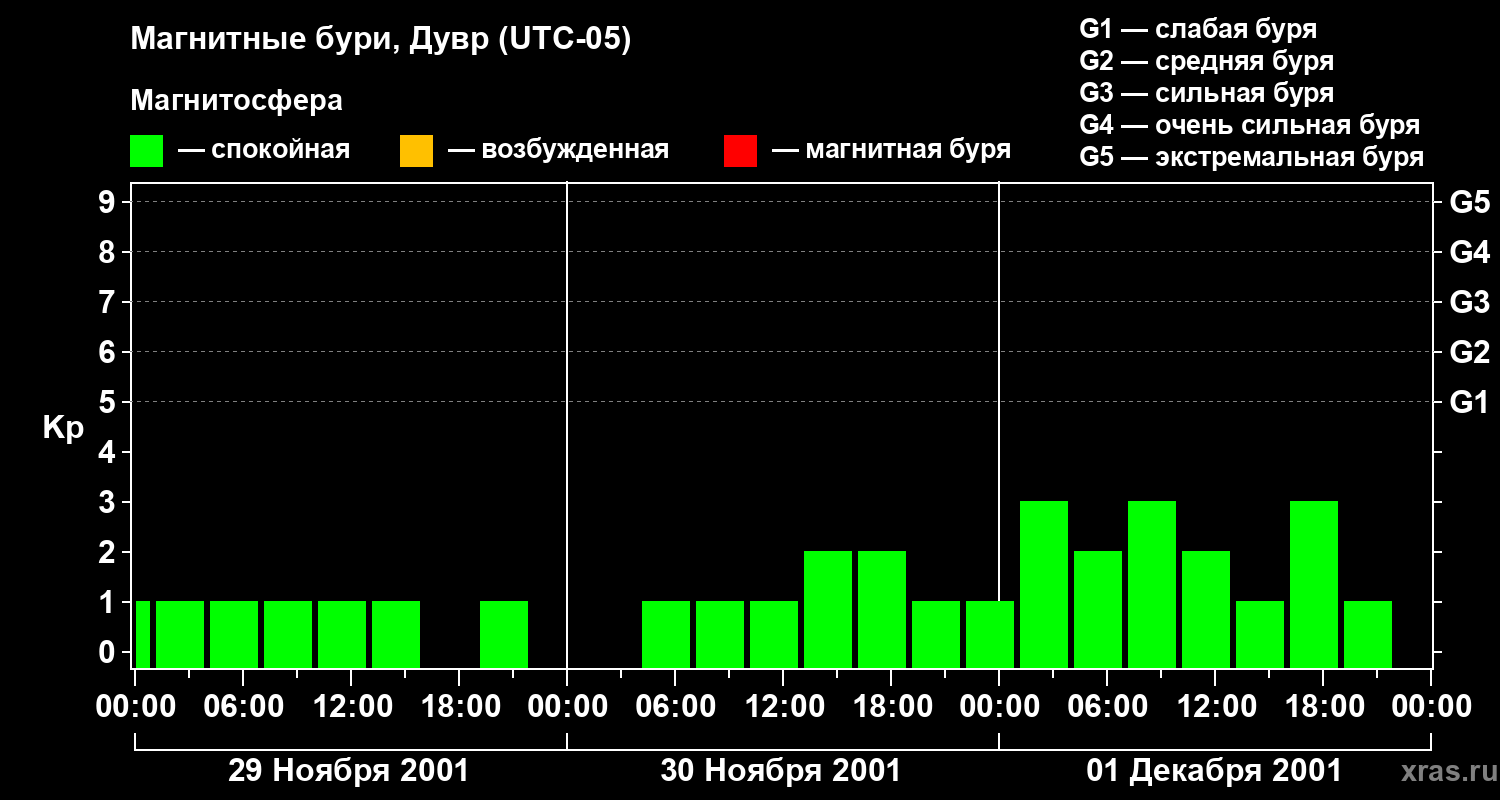 Изменения геомагнитного индекса Kp с 29 ноября по 1 декабря 2001 года для средних широт