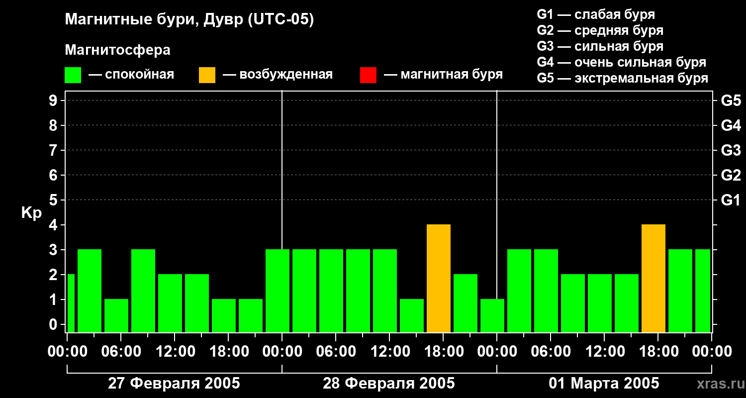 Изменения геомагнитного индекса Kp с 27 февраля по 1 марта 2005 года для средних широт