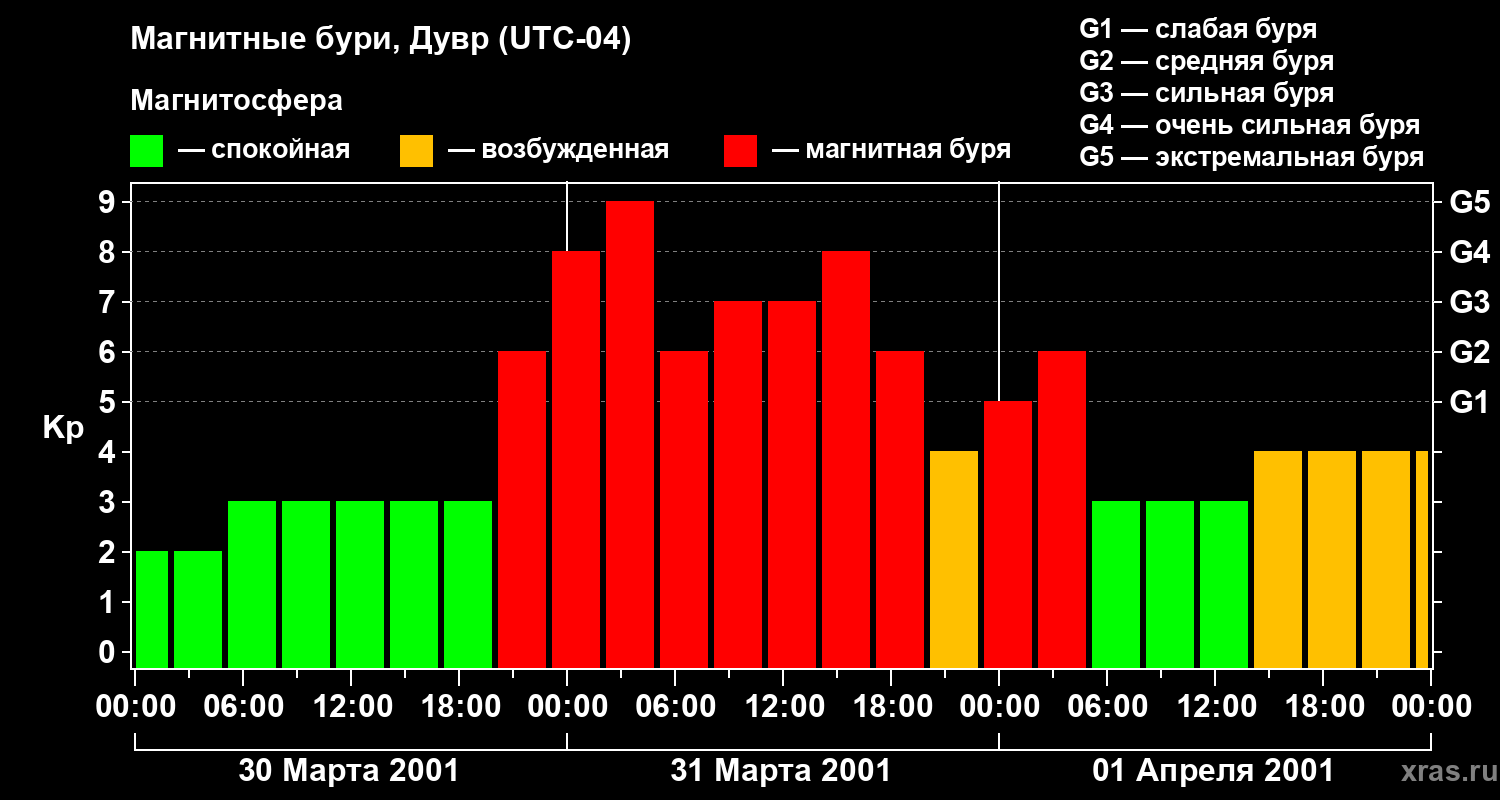 Изменения геомагнитного индекса Kp с 30 марта по 1 апреля 2001 года для средних широт