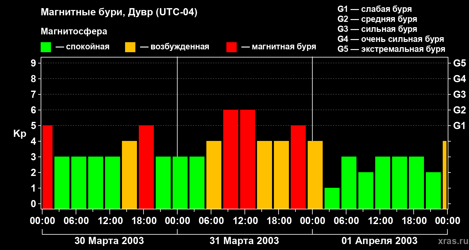 Изменения геомагнитного индекса Kp с 30 марта по 1 апреля 2003 года для средних широт