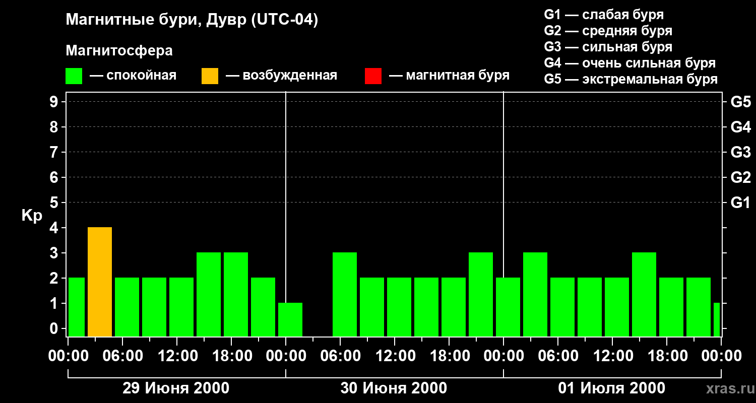 Изменения геомагнитного индекса Kp с 29 июня по 1 июля 2000 года для средних широт