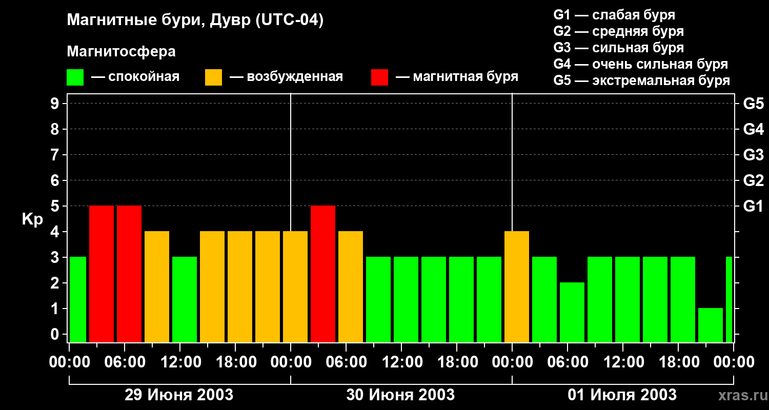 Изменения геомагнитного индекса Kp с 29 июня по 1 июля 2003 года для средних широт