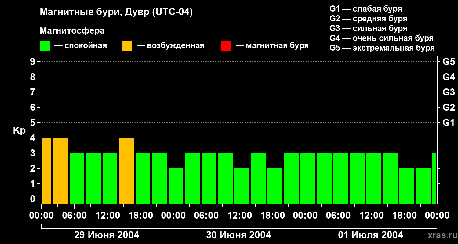 Изменения геомагнитного индекса Kp с 29 июня по 1 июля 2004 года для средних широт