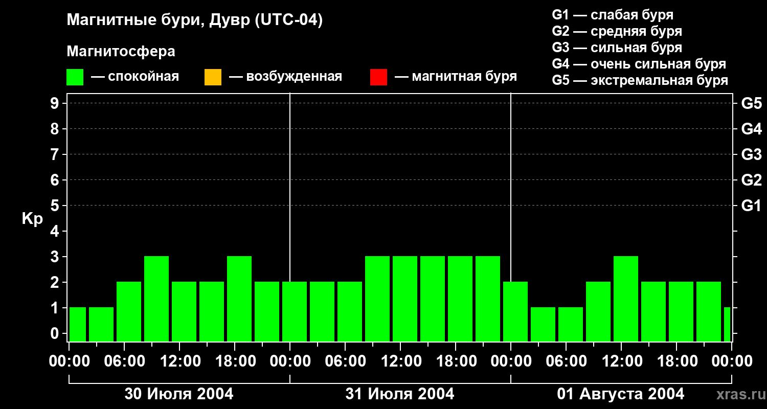 Изменения геомагнитного индекса Kp с 30 июля по 1 августа 2004 года для средних широт