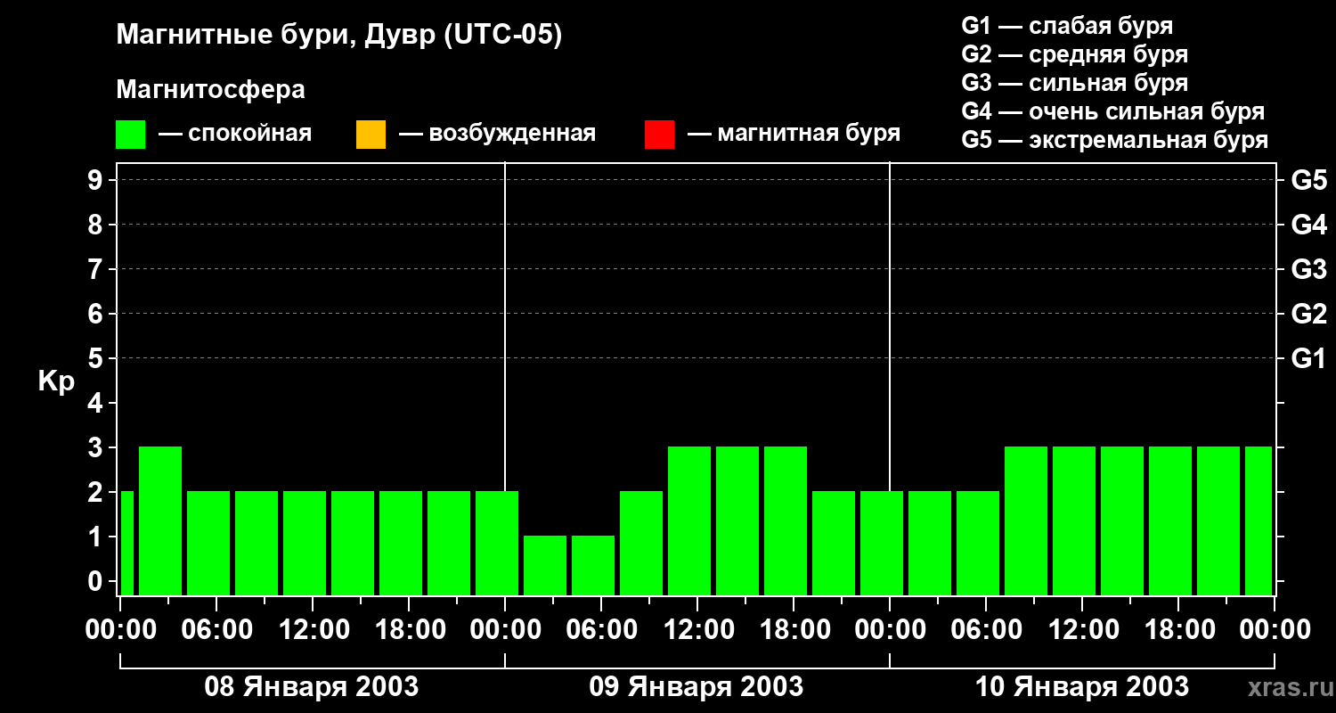 Изменения геомагнитного индекса Kp с 8 по 10 января 2003 года для средних широт