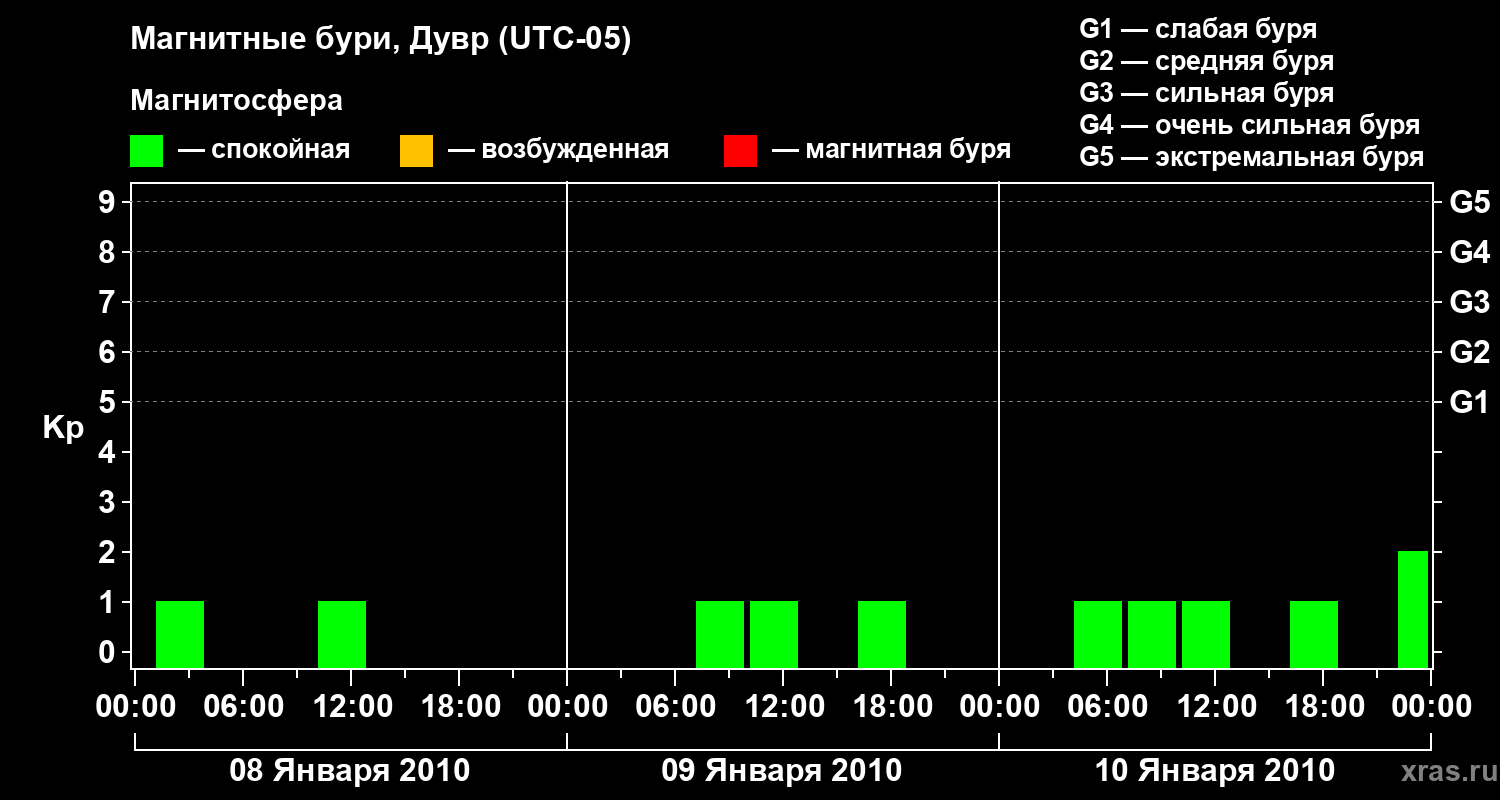 Изменения геомагнитного индекса Kp с 8 по 10 января 2010 года для средних широт
