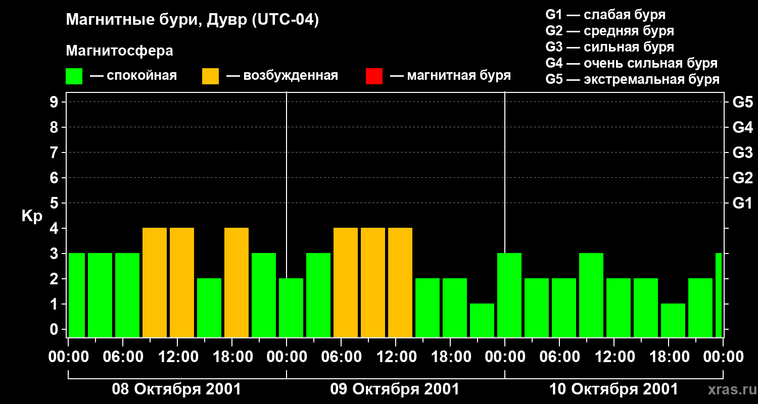Изменения геомагнитного индекса Kp с 8 по 10 октября 2001 года для средних широт