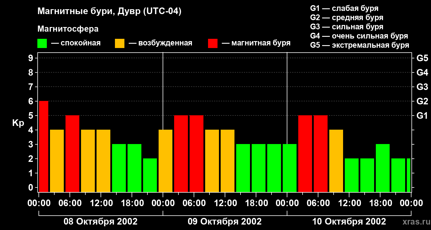 Изменения геомагнитного индекса Kp с 8 по 10 октября 2002 года для средних широт