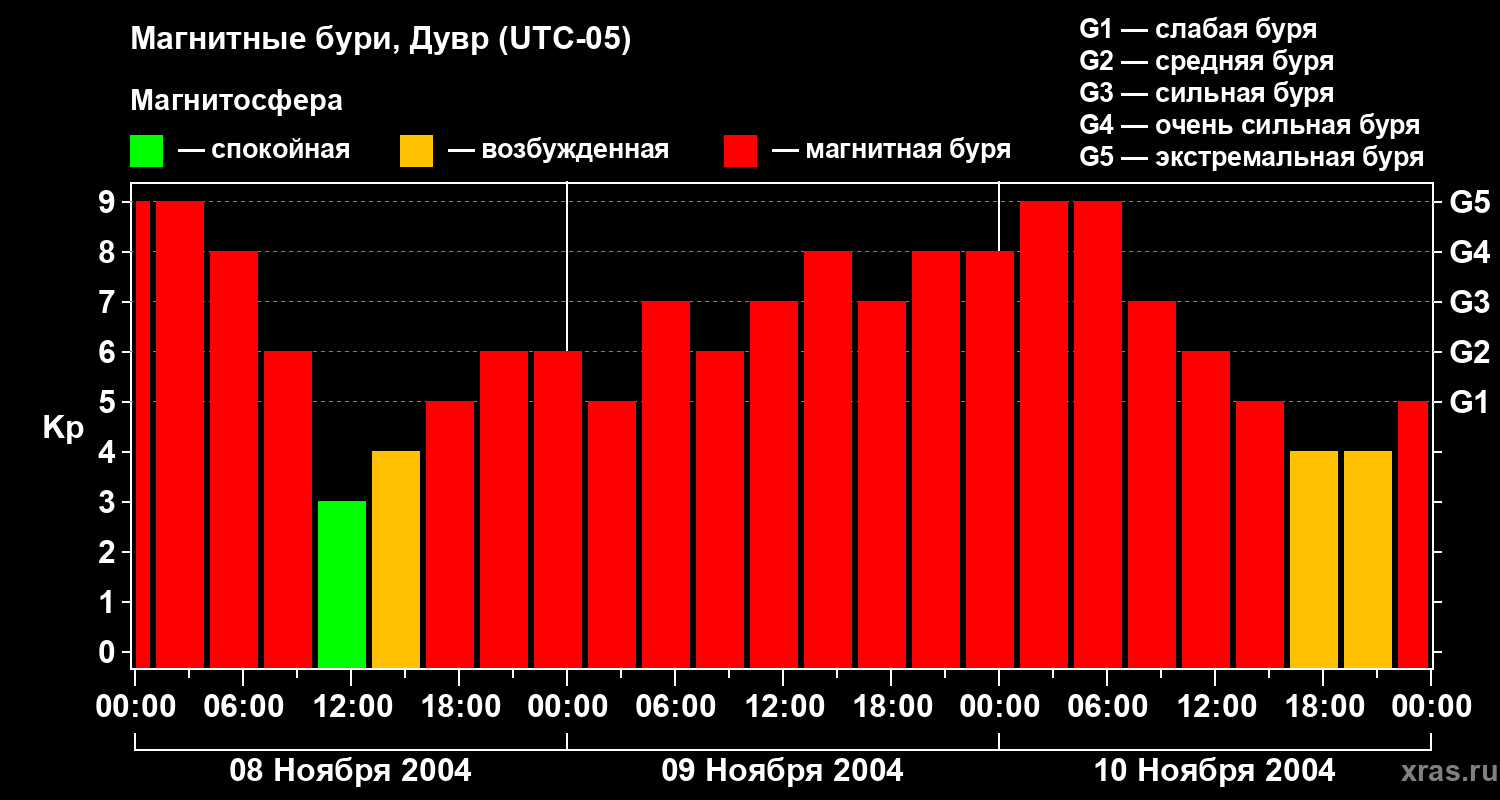 Изменения геомагнитного индекса Kp с 8 по 10 ноября 2004 года для средних широт