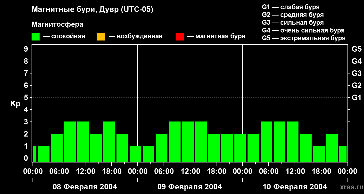 Изменения геомагнитного индекса Kp с 8 по 10 февраля 2004 года для средних широт