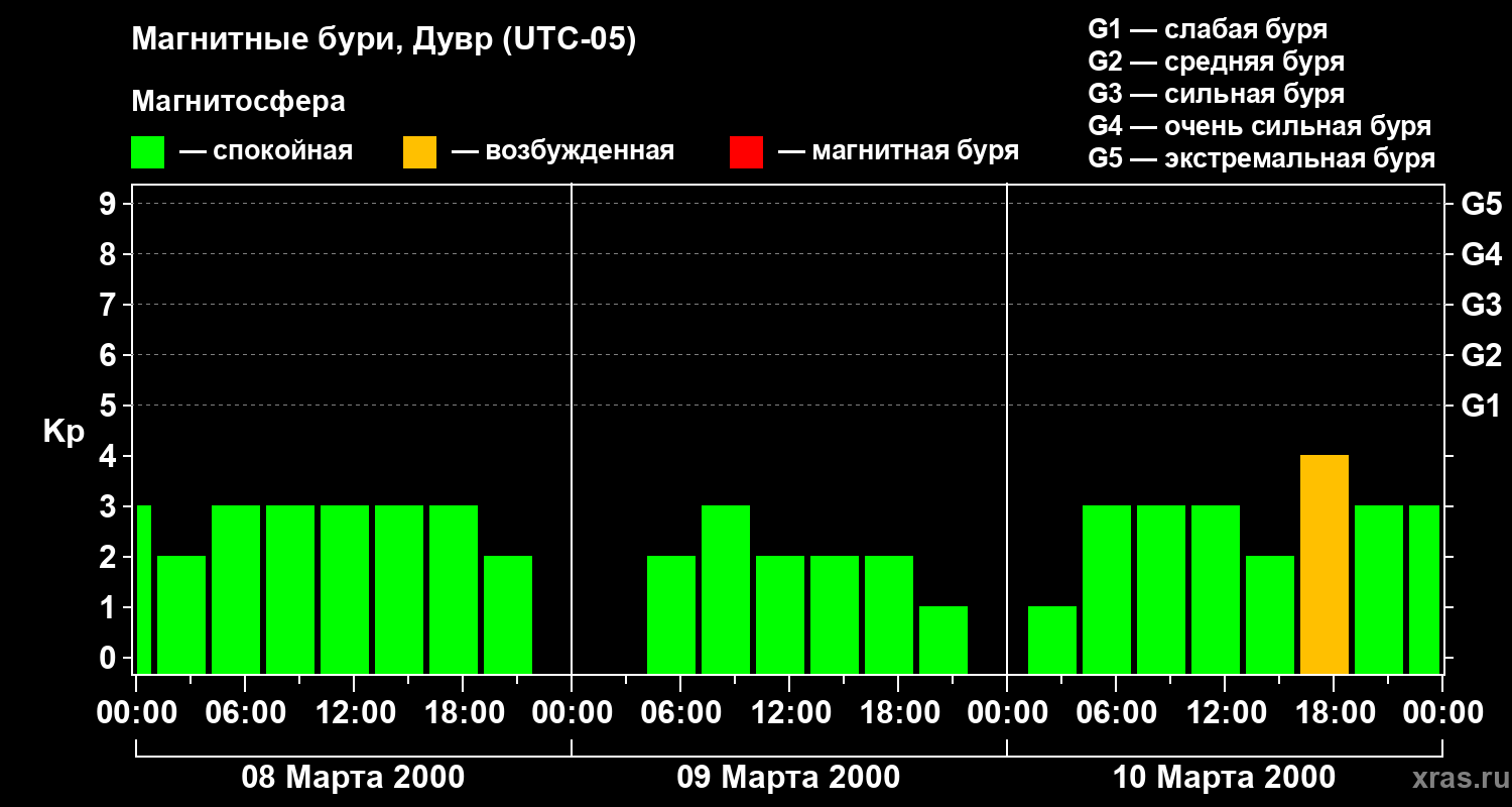 Изменения геомагнитного индекса Kp с 8 по 10 марта 2000 года для средних широт