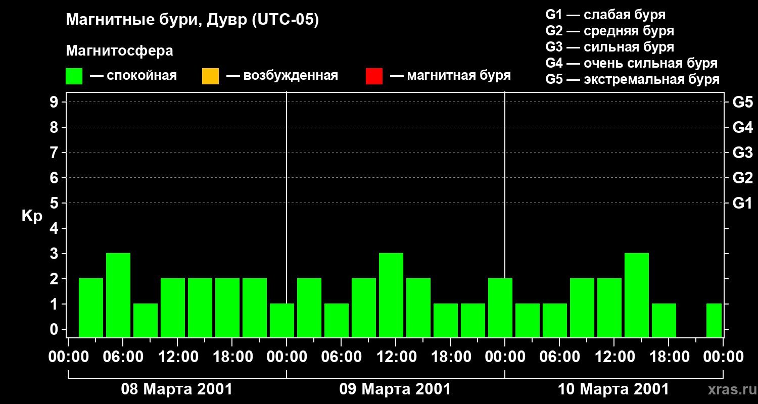 Изменения геомагнитного индекса Kp с 8 по 10 марта 2001 года для средних широт