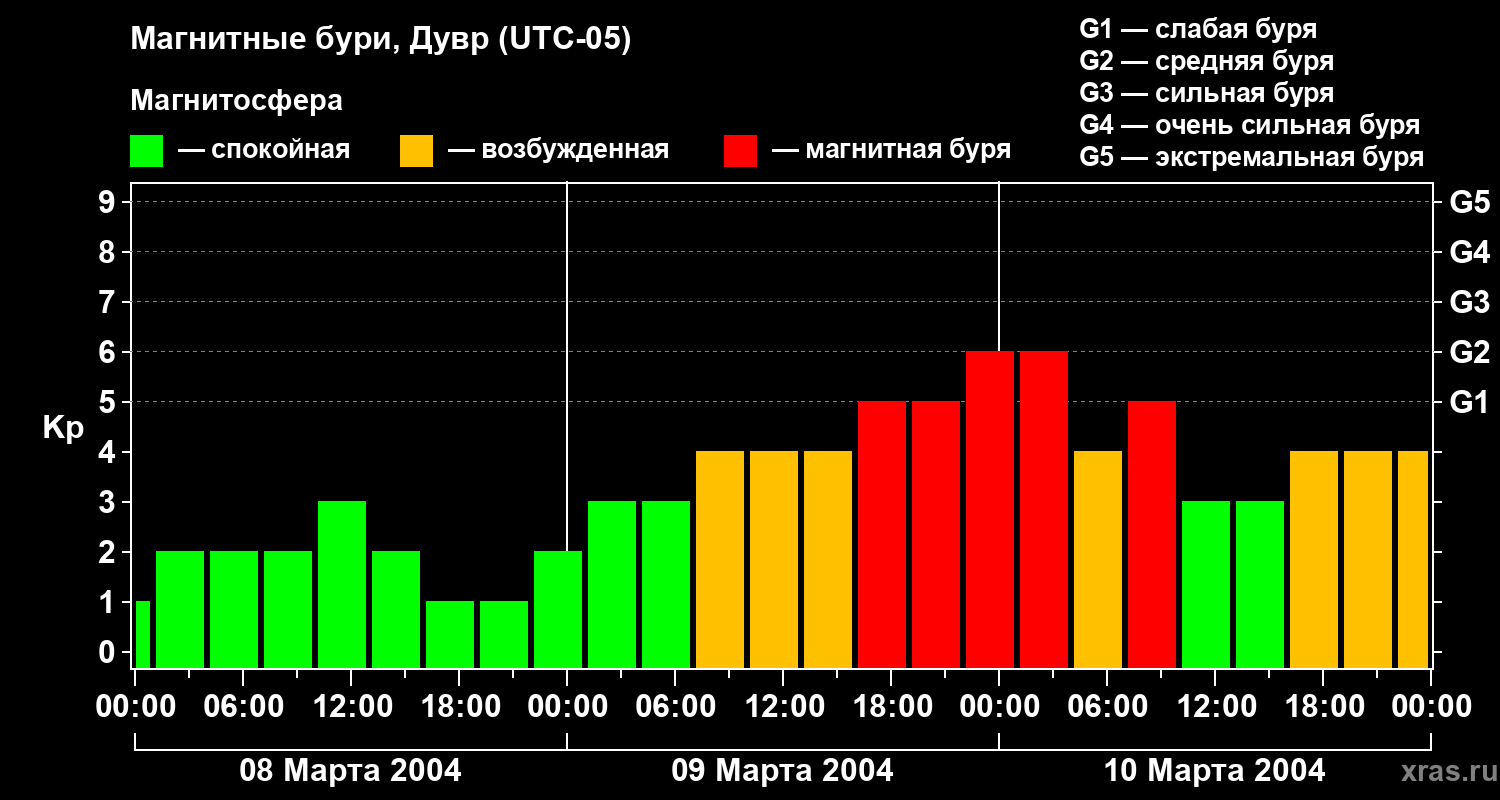 Изменения геомагнитного индекса Kp с 8 по 10 марта 2004 года для средних широт