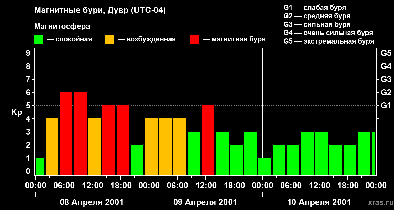 Изменения геомагнитного индекса Kp с 8 по 10 апреля 2001 года для средних широт