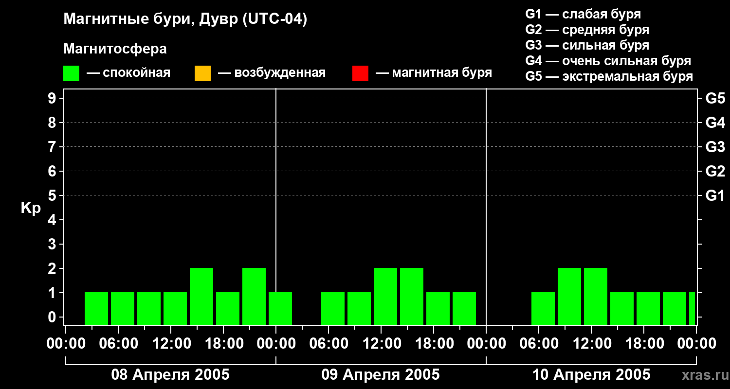 Изменения геомагнитного индекса Kp с 8 по 10 апреля 2005 года для средних широт