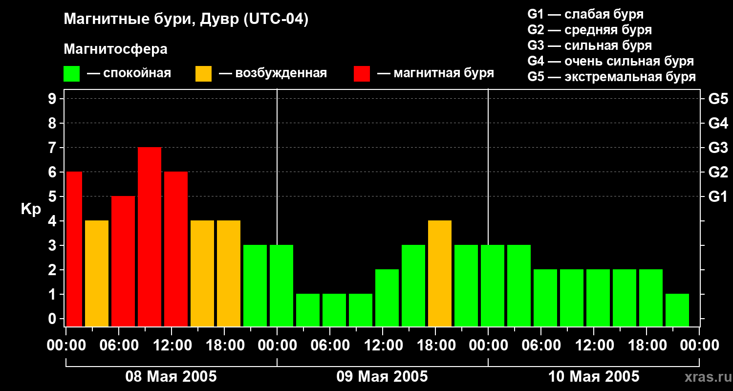 Изменения геомагнитного индекса Kp с 8 по 10 мая 2005 года для средних широт