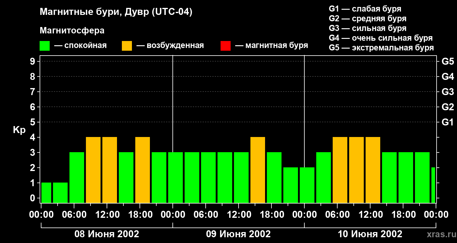 Изменения геомагнитного индекса Kp с 8 по 10 июня 2002 года для средних широт