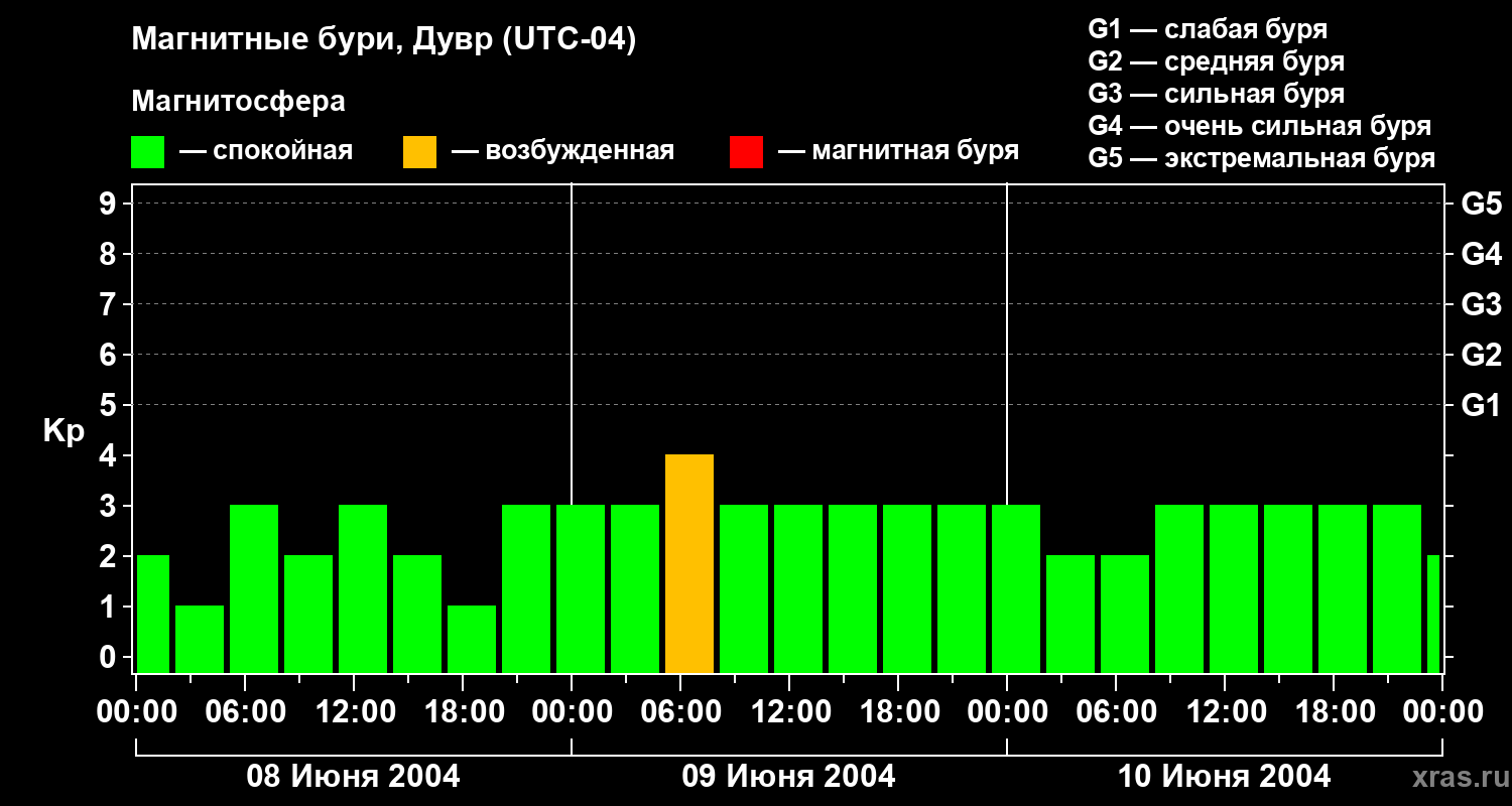 Изменения геомагнитного индекса Kp с 8 по 10 июня 2004 года для средних широт
