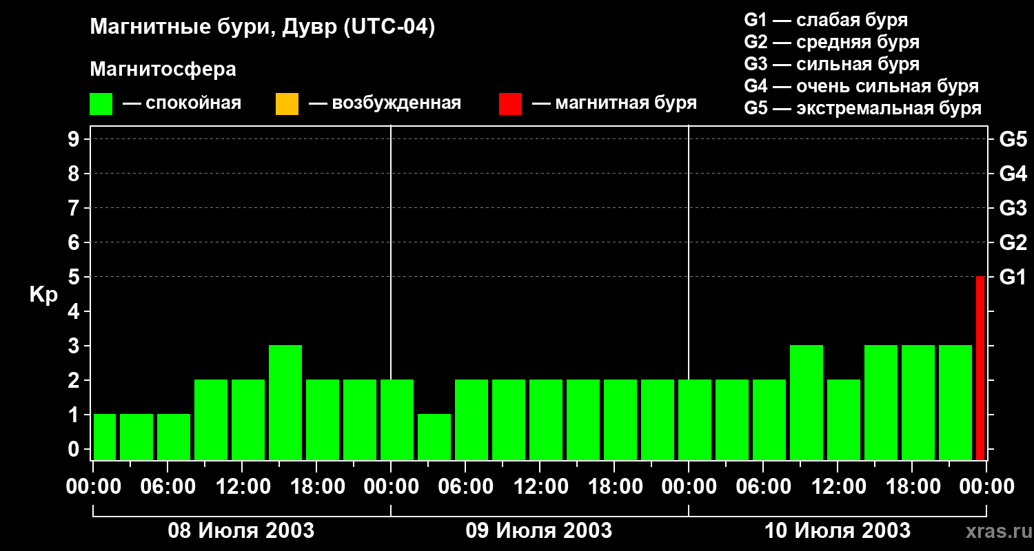 Изменения геомагнитного индекса Kp с 8 по 10 июля 2003 года для средних широт
