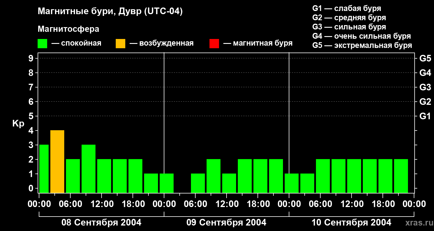 Изменения геомагнитного индекса Kp с 8 по 10 сентября 2004 года для средних широт
