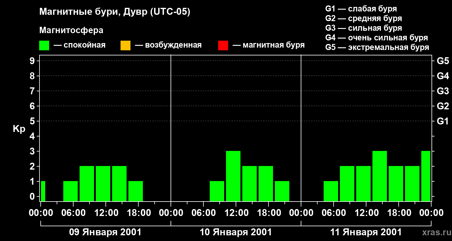 Изменения геомагнитного индекса Kp с 9 по 11 января 2001 года для средних широт