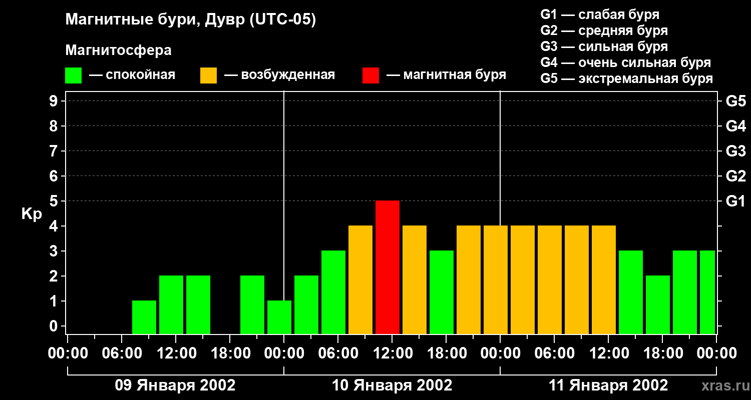 Изменения геомагнитного индекса Kp с 9 по 11 января 2002 года для средних широт