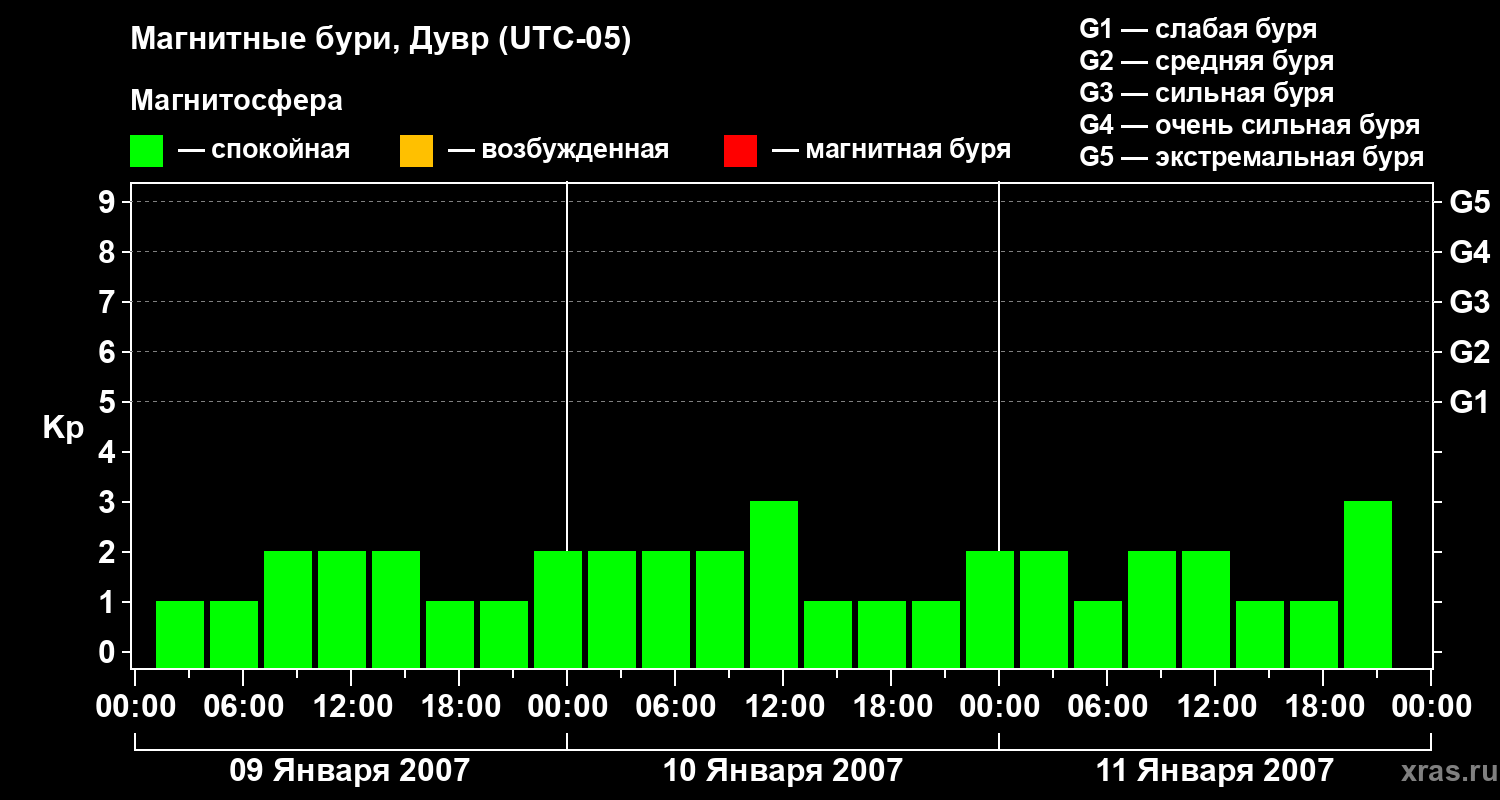 Изменения геомагнитного индекса Kp с 9 по 11 января 2007 года для средних широт