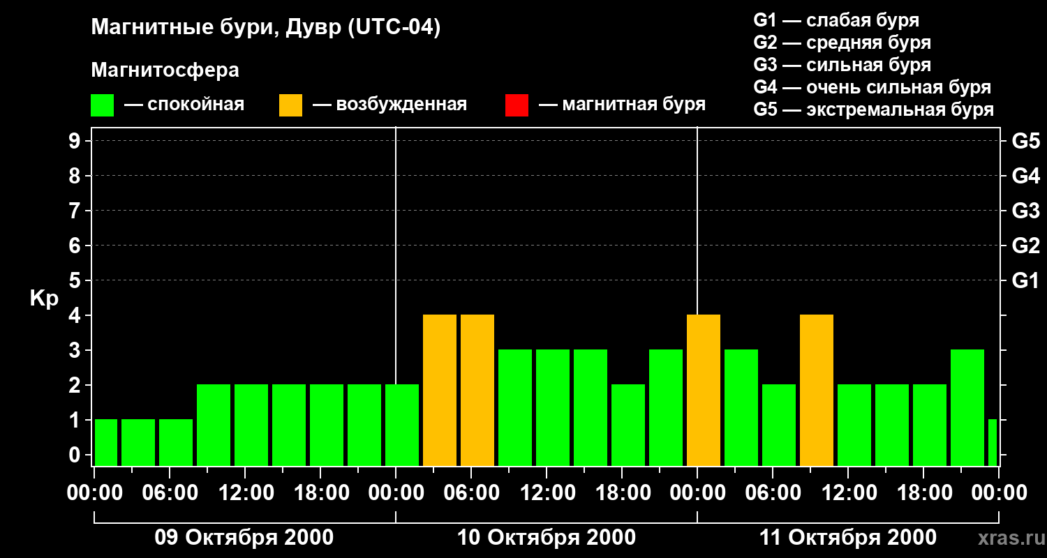 Изменения геомагнитного индекса Kp с 9 по 11 октября 2000 года для средних широт