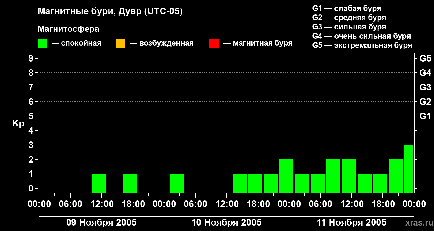 Изменения геомагнитного индекса Kp с 9 по 11 ноября 2005 года для средних широт