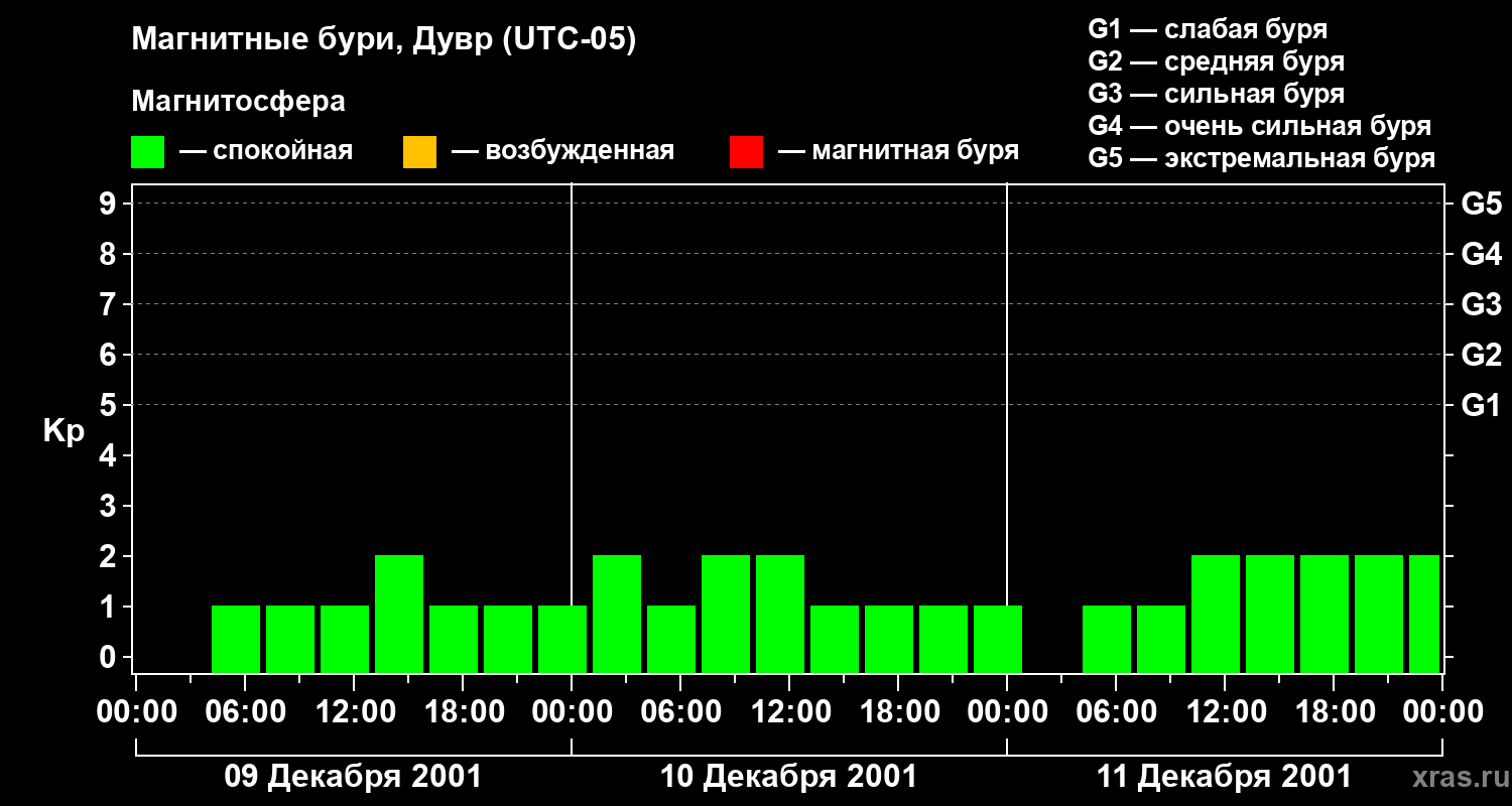 Изменения геомагнитного индекса Kp с 9 по 11 декабря 2001 года для средних широт