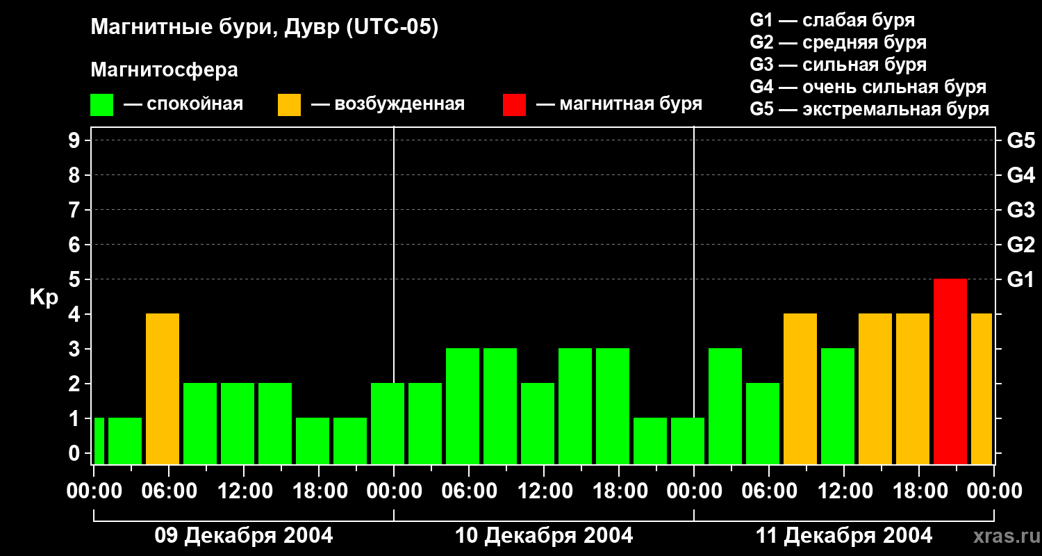 Изменения геомагнитного индекса Kp с 9 по 11 декабря 2004 года для средних широт