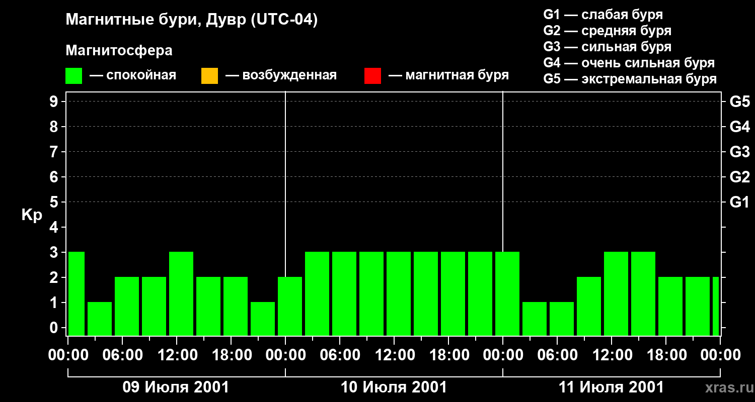 Изменения геомагнитного индекса Kp с 9 по 11 июля 2001 года для средних широт