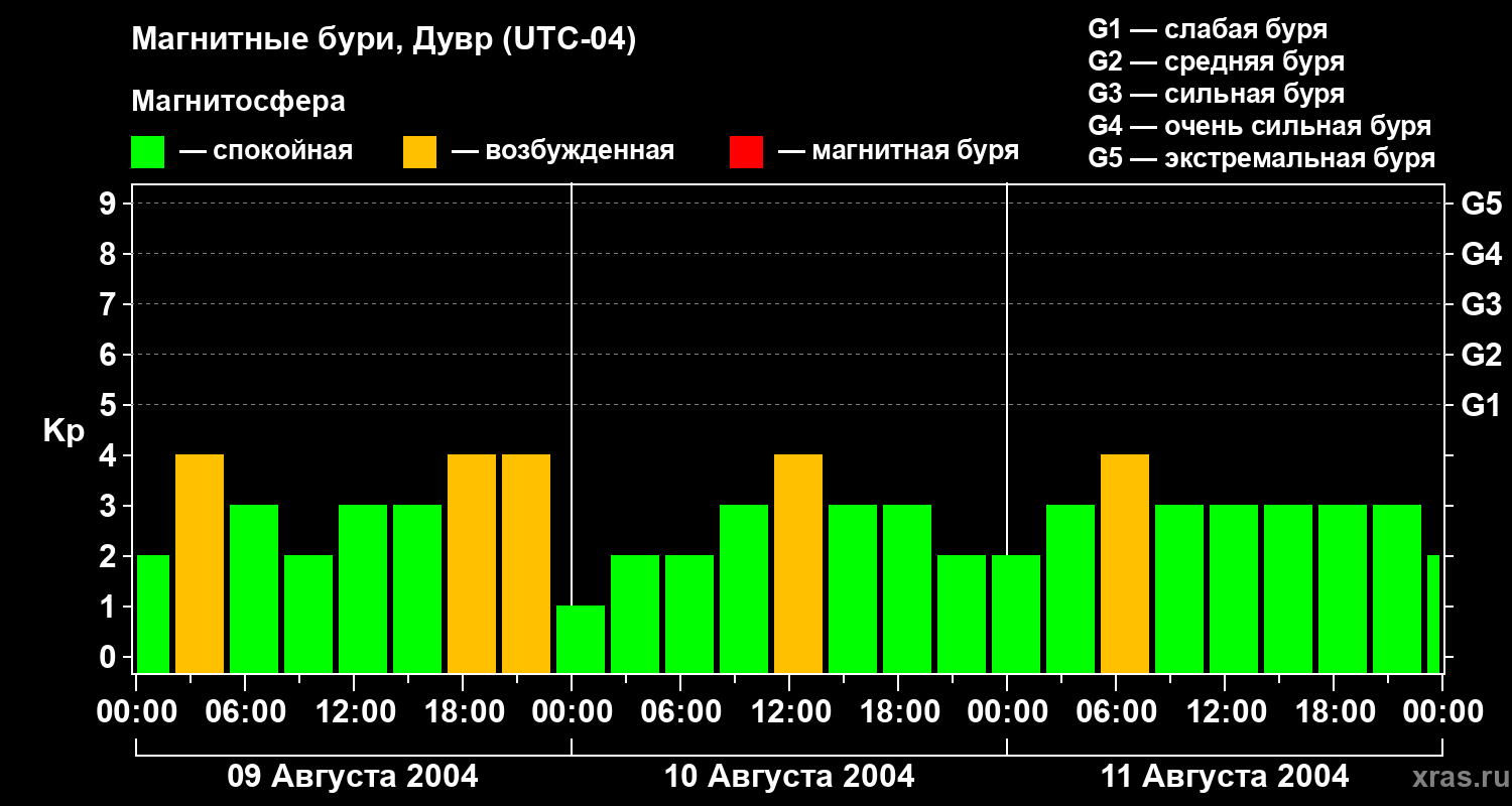 Изменения геомагнитного индекса Kp с 9 по 11 августа 2004 года для средних широт