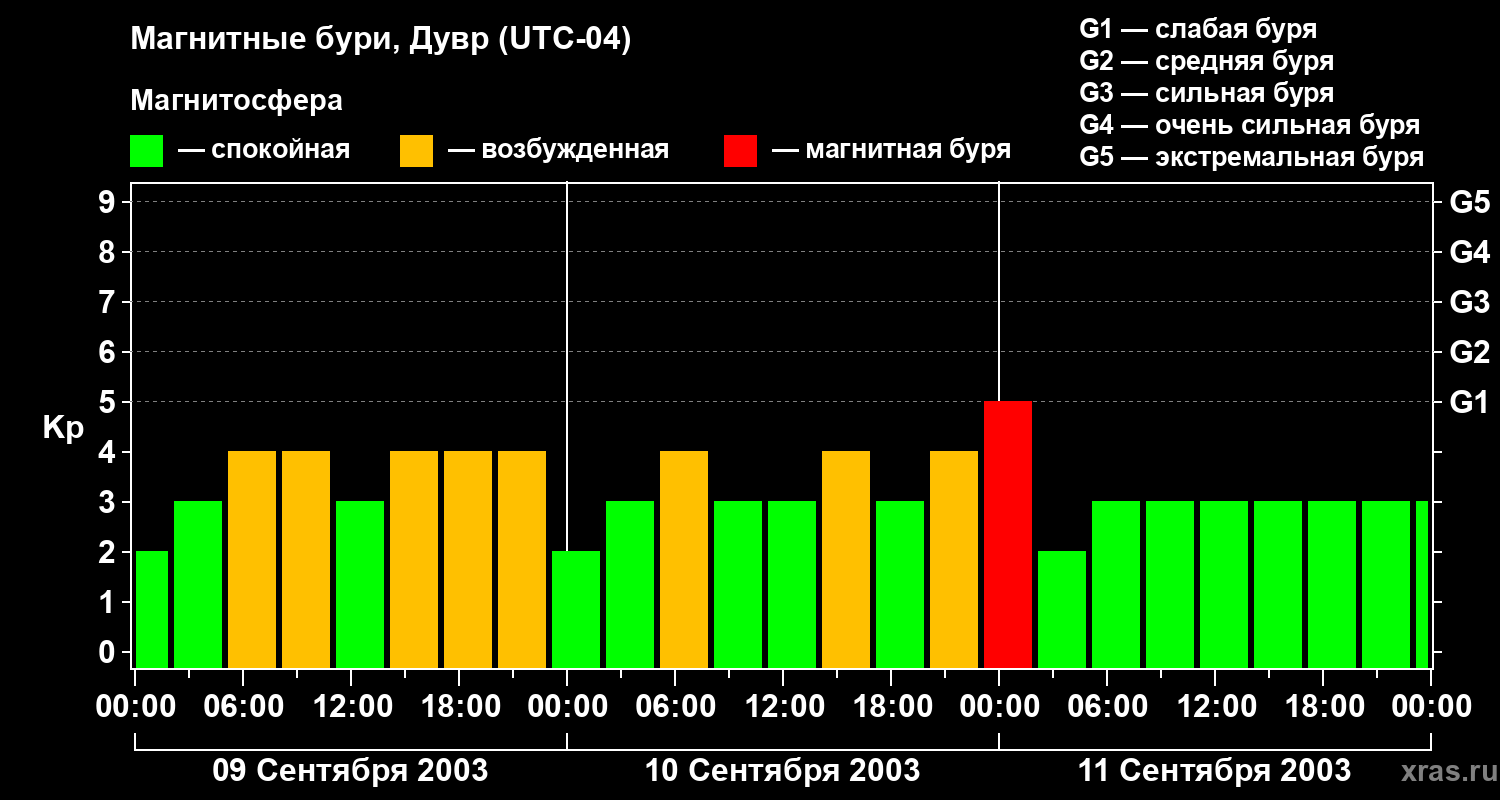 Изменения геомагнитного индекса Kp с 9 по 11 сентября 2003 года для средних широт