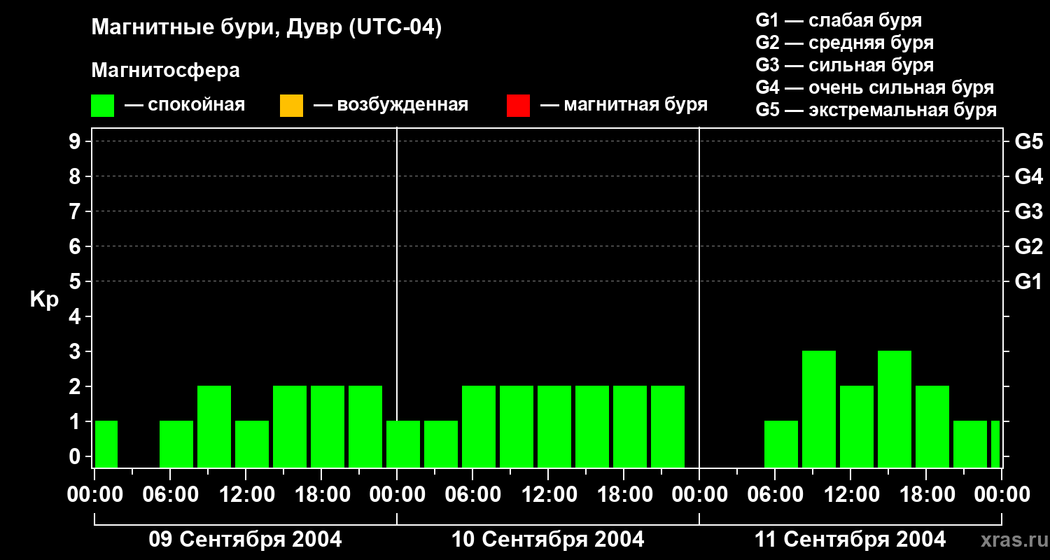 Изменения геомагнитного индекса Kp с 9 по 11 сентября 2004 года для средних широт