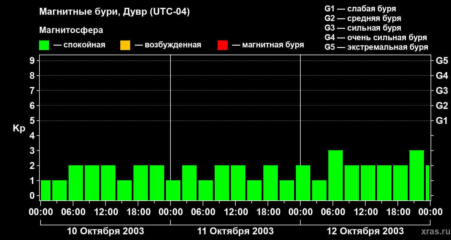 Изменения геомагнитного индекса Kp с 10 по 12 октября 2003 года для средних широт